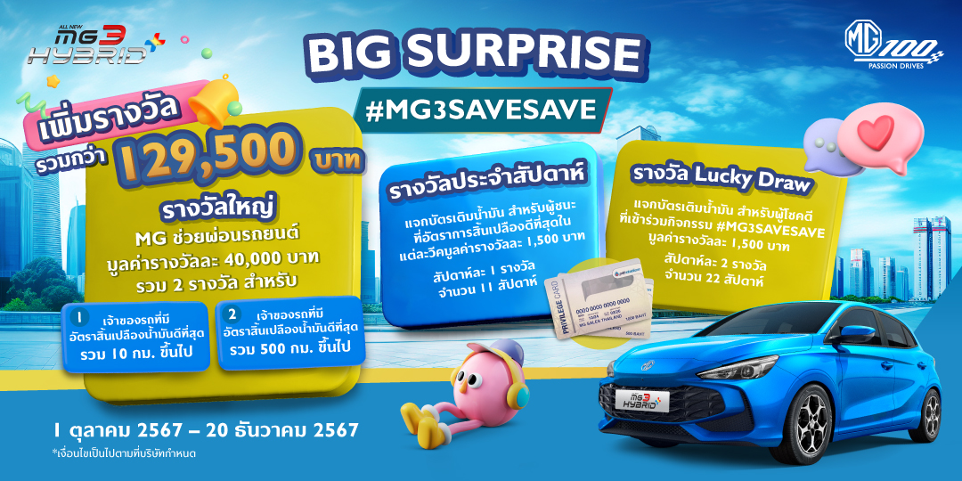 - ผู้ชนะกิจกรรมจะได้รับรางวัลเป็น MG ช่วยผ่อนรถยนต์ 5 เดือน มูลค่า 40,000 บาท 1 รางวัล สำหรับเจ้าของรถ ALL NEW MG3 HYBRID+ ที่ทำอัตราการสิ้นเปลืองที่ดีที่สุด และมีระยะทางรวม 10 กิโลเมตรขึ้นไป*